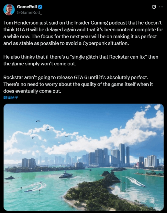近日,R星宣布《侠盗猎车手6(GTA6)》已从原定的2026年5月发售再次延期,新的发布日期为2026年11月19日。知名业内人士Tom Henderson在最近的播客节目中表示,他认为《GTA6》不会再延期,并透露游戏的“内容制作已经完成”Henderson指出,当前开发团队的主要任务是确保游戏在未来一年内达到完美和稳定的状态,以避免重蹈《赛博朋克2077》的覆辙。他强调,R星追求完美,力求发布时无任何BUG。