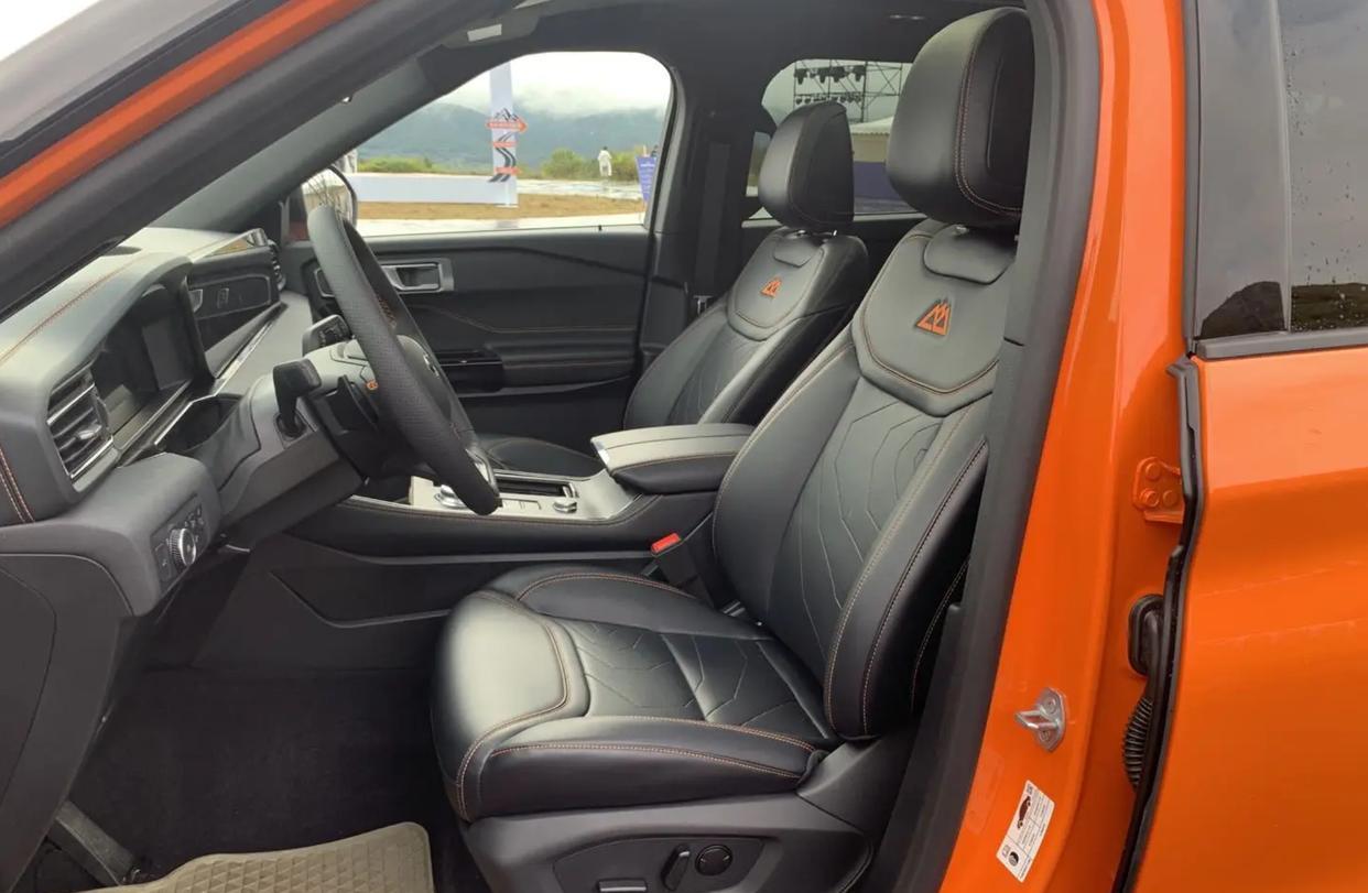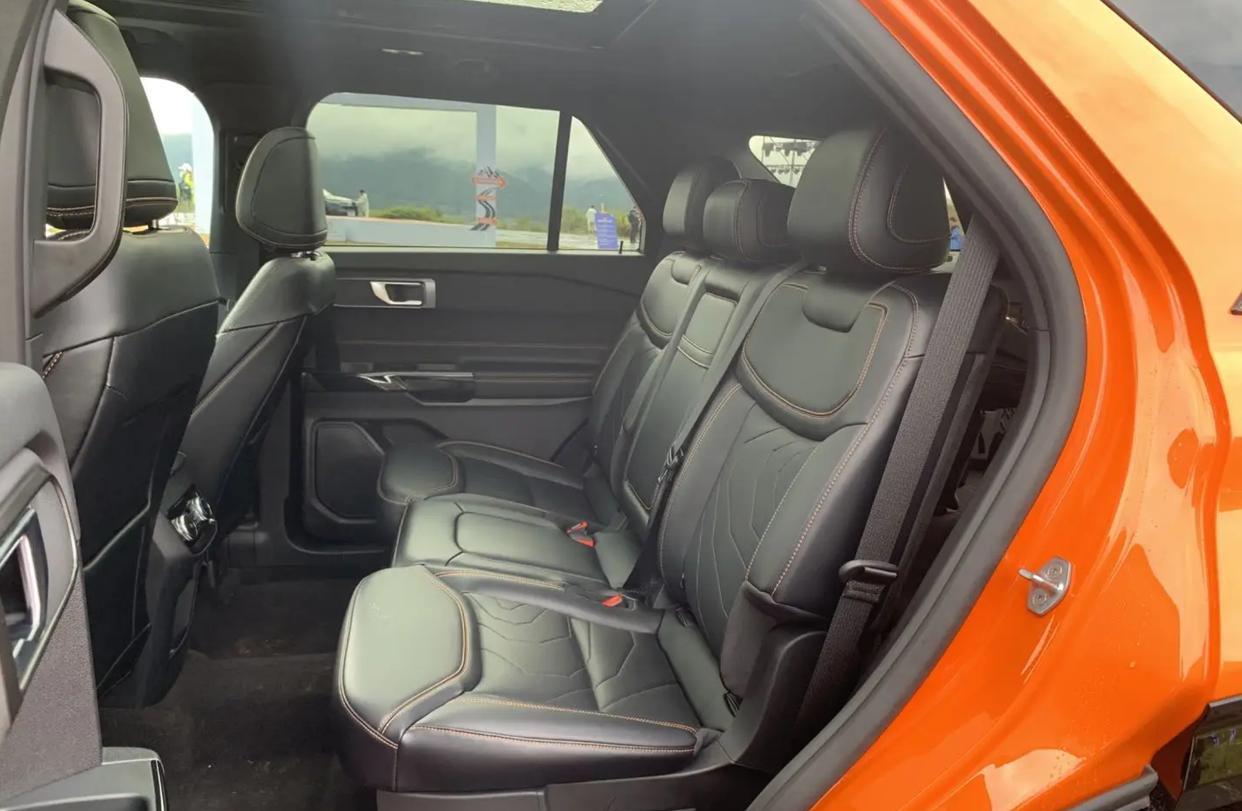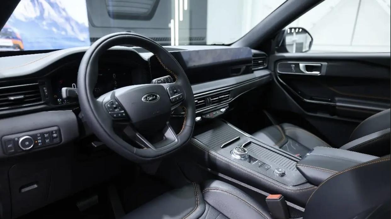 全新福特探险者采用了经典的布局设计,大面积黑色皮革材质的包裹,再加上黑色钢琴烤漆面板和银色镀铬装饰条的点缀,很细致的无缝拼接工艺,质感和工艺都为上乘,每一处细节都经得起推敲。中控台配备了12.3英寸全液晶仪表+27英寸4K中控连屏设计,内置SYNC+3.0智行互联系统,中控通道区域配有双无线充电面板、旋钮式电子换挡机构以及纵置双杯架布局。配置方面,无钥匙进入/启动、一键启动、真皮座椅、前排座椅加热/通风、USB接口、Type C接口、12V电源接口、B&O音响、夹层降噪前挡风、后排隐私玻璃、后遮阳帘、后排空调出风口、360度全景影像、全景天窗、电子差速器、自动空调……
