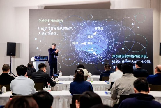 在主旨报告环节,同济大学设计创意学院长聘教授范圣玺带来《AIGC生态设计教育的进化》分享。他指出,数智时代的到来不仅是技术迭代,更重塑了思维方式,“AI带来的变革远比工业革命更深刻,它改变了思维主体、客体和工具,让物理世界、人类世界、虚拟世界形成三元结构,人机共生成为常态。”