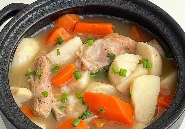 2、排骨放到汤锅,加适量清水炖煮35分钟,加胡萝卜炖煮15分钟,加芋头炖煮15分钟,放盐和少许生抽,撒上香葱就可以出锅啦。