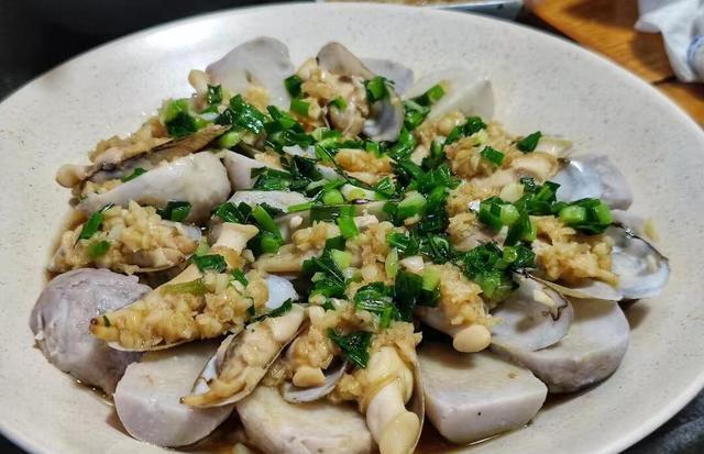 4、熟芋艿垫在盘底,摆上蛏子壳,放蛏子肉,肉上撒蒜蓉酱,这个分量的蒜蓉酱是差不多刚好能用完的,回锅蒸5,6分钟。另外加热一份油20/30克,油烧热后加入葱花,激出葱香后淋入盘中,最后淋点豉油,没有豉油用生抽代替。