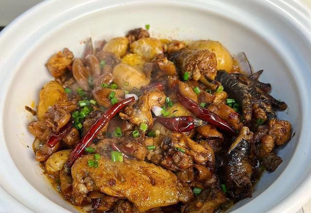 食材:鸡肉、芋仔、肥肠、大葱、干辣椒;