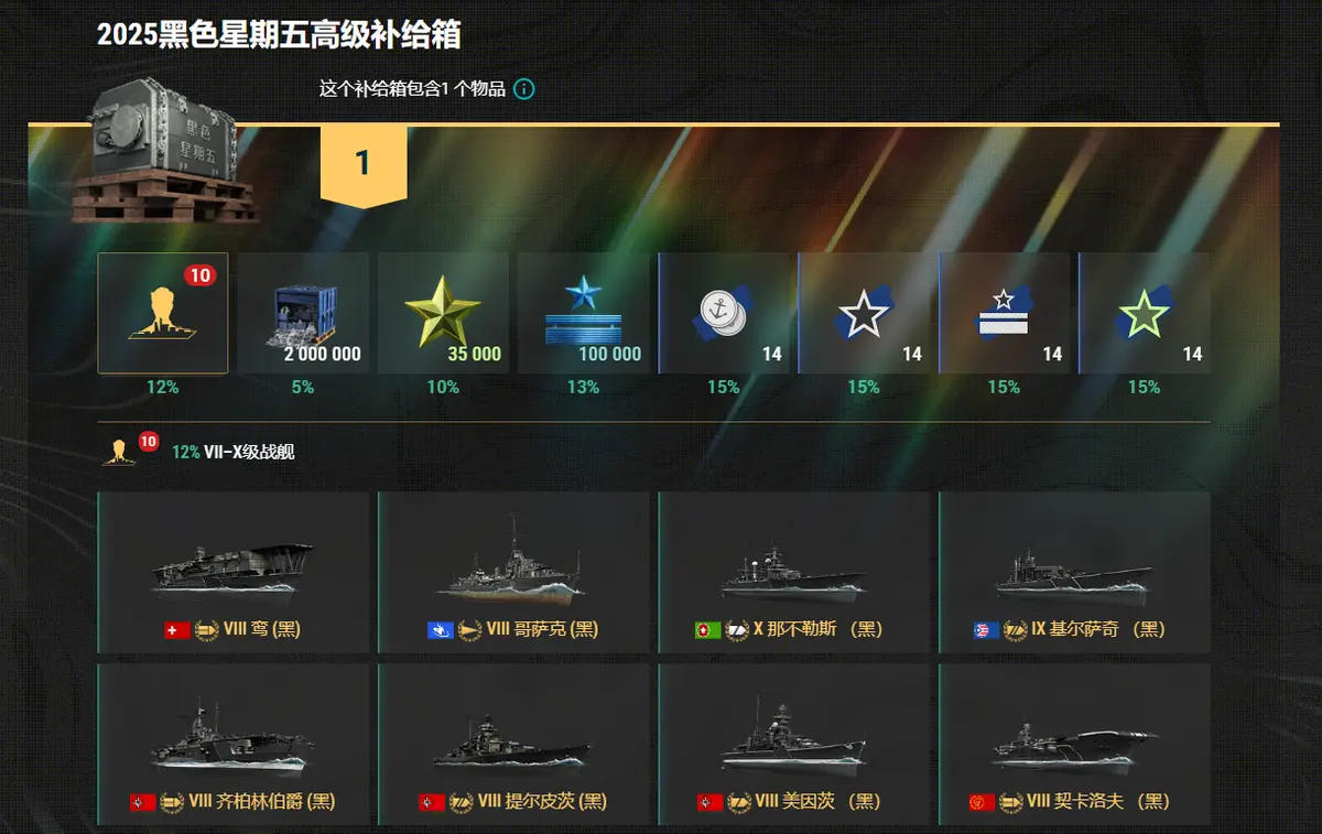 为什么说惊吓?因为《战舰世界》黑五活动的性价比实在高得吓人!拿今年的黑五活动来说吧,黑五补给箱的战舰爆率高达12%,比以往一般箱子的爆率高4、5倍都不止,而且首15抽必出黑五战舰,手气再非,投入15抽就能保底拿船!至于多少级的就看运气了,反正能出就是赚到。