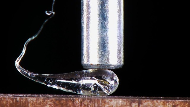 大约是700兆帕,接近大气压力的7000倍,这个强度差不多可以抵抗20吨的压力,不过这种表面的压层也很薄,大约是液滴头部直径的10%。