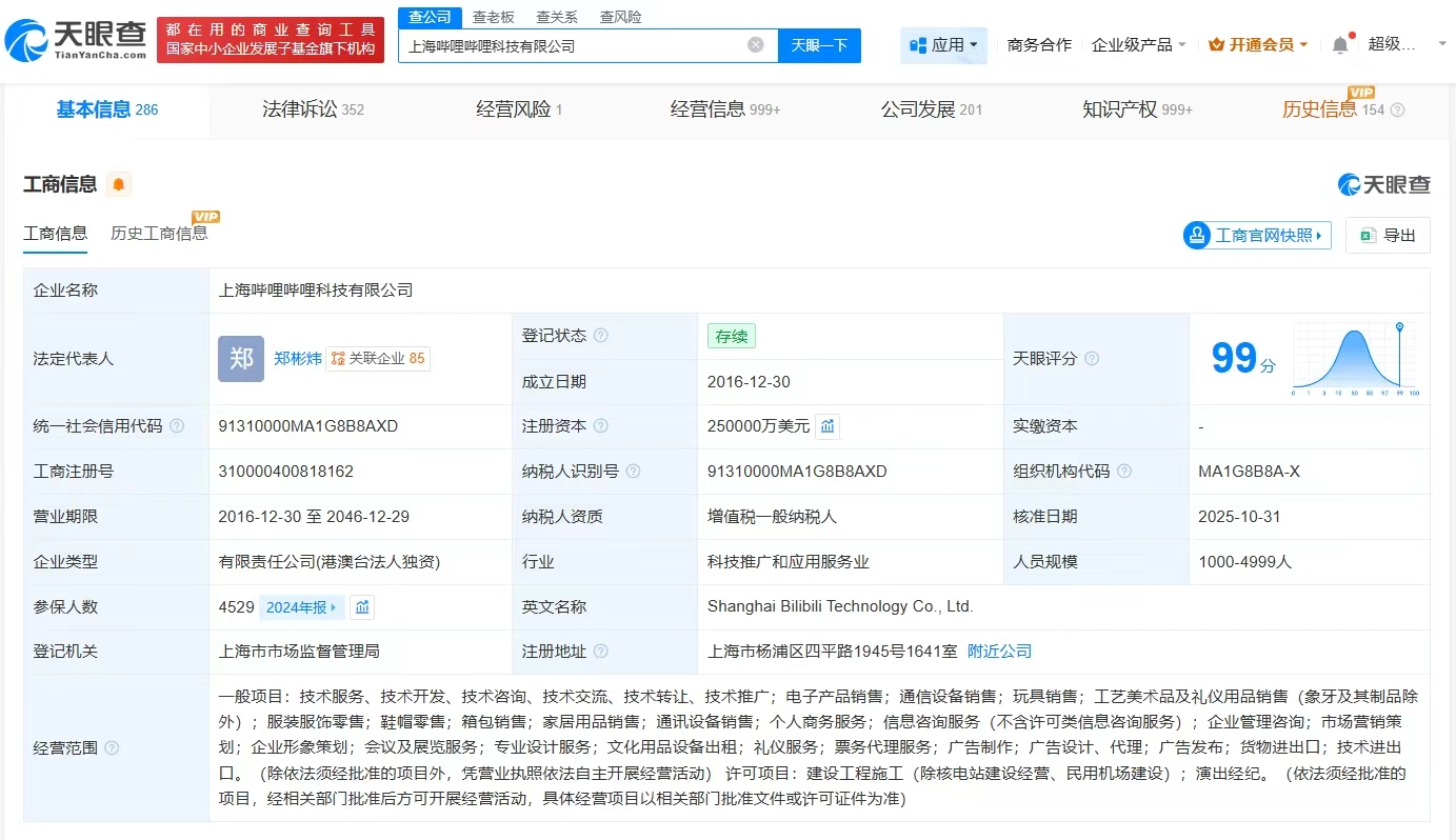 天眼查工商信息显示,近日,上海哔哩哔哩科技有限公司发生工商变更,陈睿卸任总经理、财务负责人。