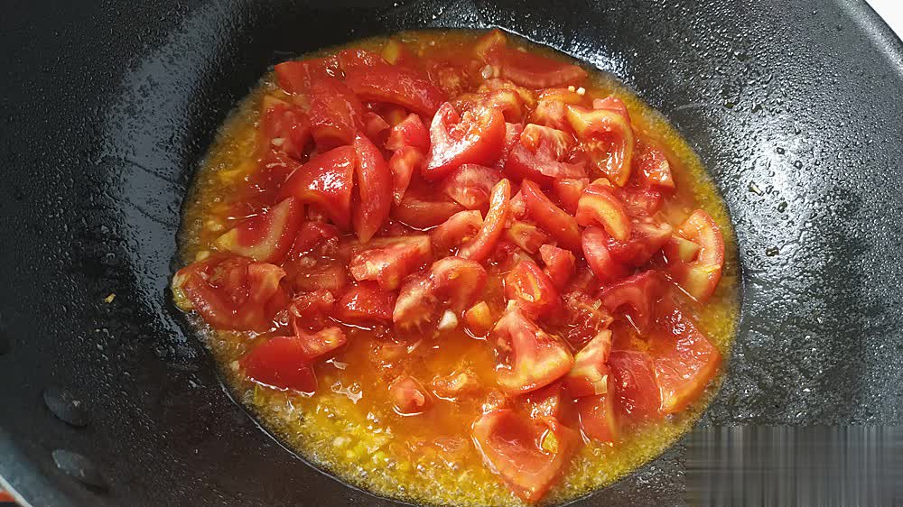 【步骤七】:西红柿炒出汁后,放一勺番茄酱约50克,继续翻炒几下,人西红柿汁和番茄酱充分融合后,添一大碗水,水的量没过西红柿三分之一就好,大火烧开后煮5分钟左右,把西红柿和番茄酱的味道煮出来。