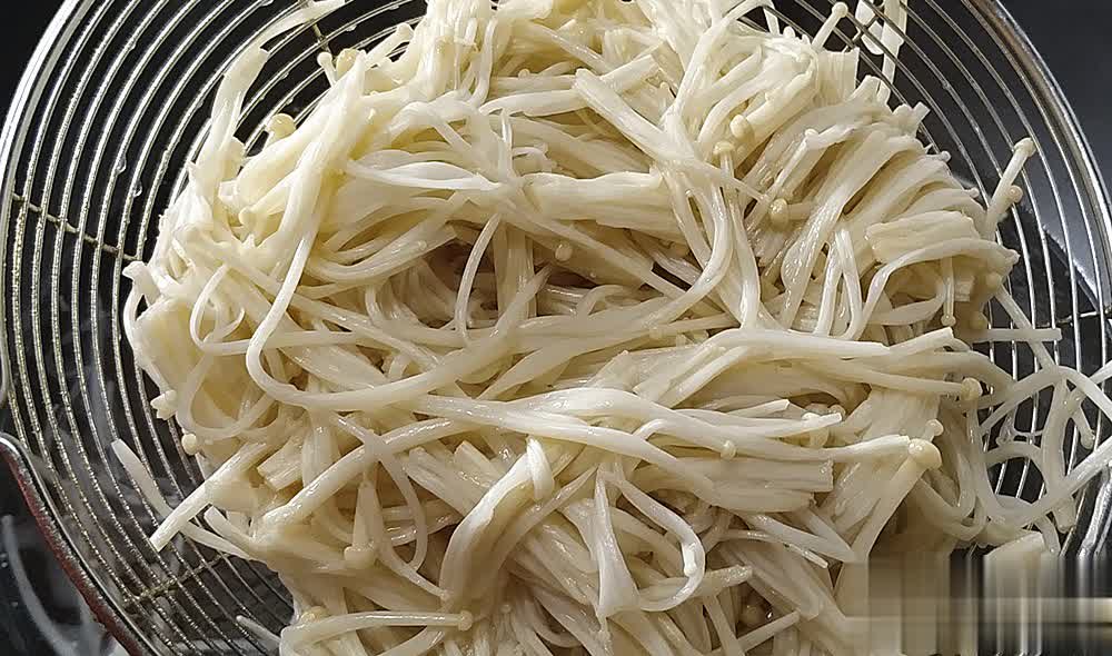 【步骤五】:金针菇把根切掉,用手撕开清洗干净后放开水锅中焯一下水,用以去除草酸和农药残留,焯水一般大约1分钟左右。然后捞出来用凉水冲一下沥干水分备用。