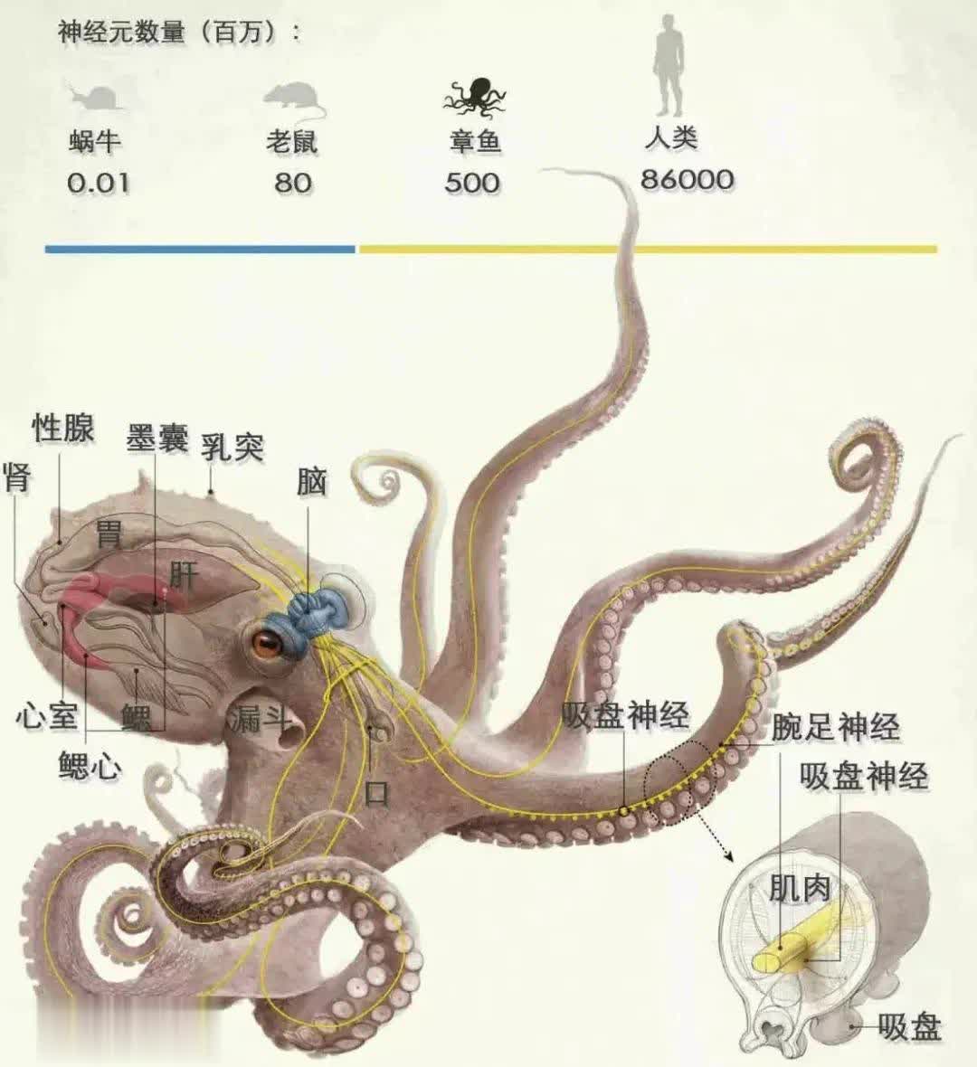衡量一个动物是否聪慧的指标之一便是“神经元数量”,虽然并非绝对,但也有很高的参考性,蚂蚁、龙虾这类低等智慧生物体内神经元数量约10万个,老鼠约为8千万个,而章鱼体内的神经元数量高达5亿。