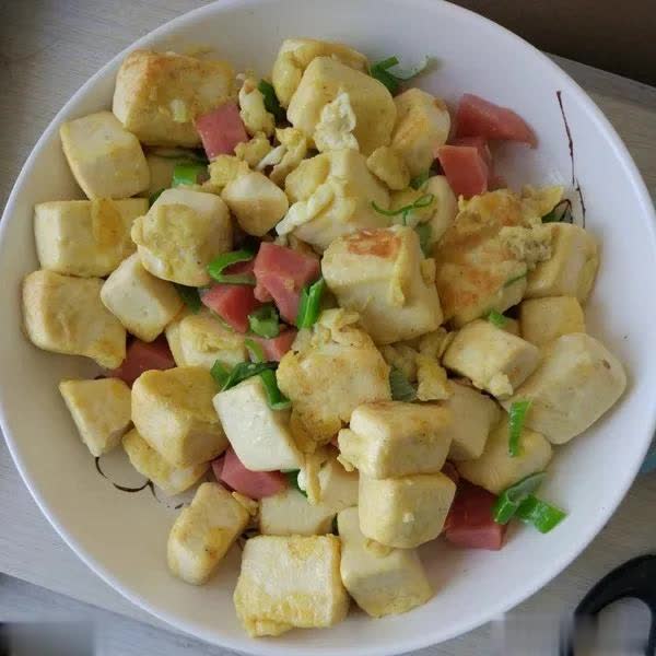 食材:鸡蛋;豆腐;火腿;香葱;料酒;油;盐;水淀粉