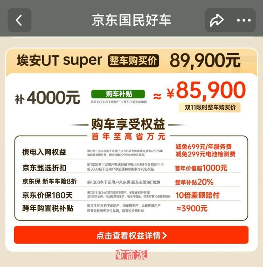 近日,京东联合广汽集团、宁德时代正式推出“国民好车”埃安UT super,电池租用购车价仅4.99万元,整车购买价为8.99万元,远低于此前市场预测的10-12万的售价。现在,在京东APP搜索“国民好车”,已经可以预约试驾、支付定金了。