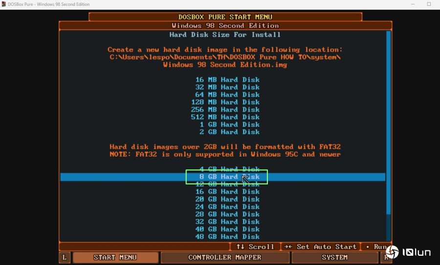 3. 为安装创建硬盘映像。我选择了8 GB的映像,因为我使用的是Windows98第二版。如果你准备创建更早的硬盘映像(比如用于DOS),请选择合适的容量。注意,映像文件(IMG)的位置显示在屏幕顶部,你可以将此映像复制到其他运行DOSBox Pure Unleashed的设备上。