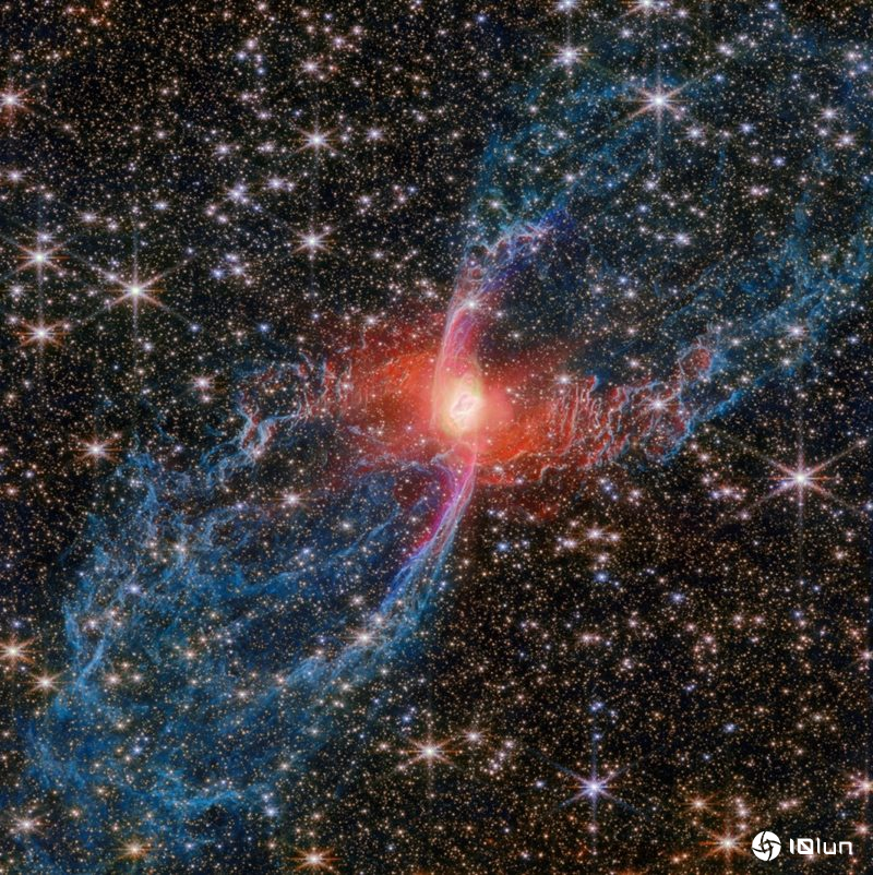 形象可见红蜘蛛星云的中心恒星,光芒比周围尘埃气体更亮。韦伯太空望远镜NIRCam揭示星云炽热和明亮中心恒星令人惊讶的性质。光学图像如NASA/ESA哈勃太空望远镜,这颗恒星显得微弱且显现蓝色。但NIRCam形象却呈红色:因灵敏的近红外能力,韦伯太空望远镜揭示中心恒星周围的热尘埃罩,可能以圆盘结构绕中心恒星运行。