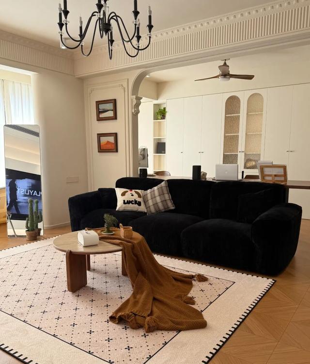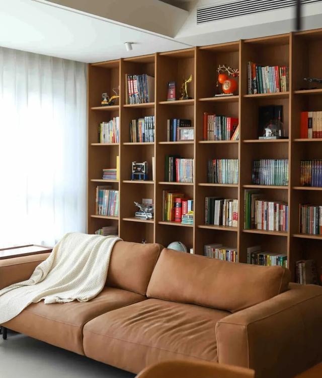 2)想放沙发可以选矮背款的,满墙书柜视觉上偏厚重,如果配高背沙发,空间会显得挤挤巴巴,低矮沙发能让整体更通透。