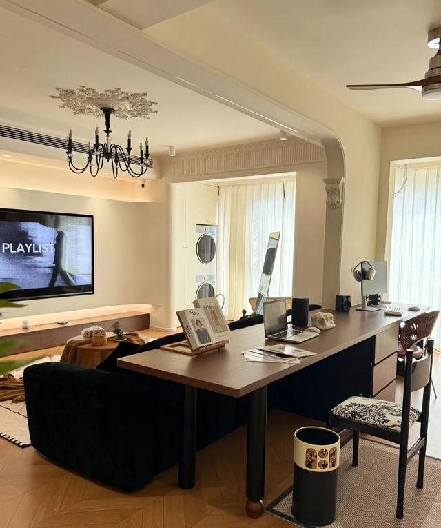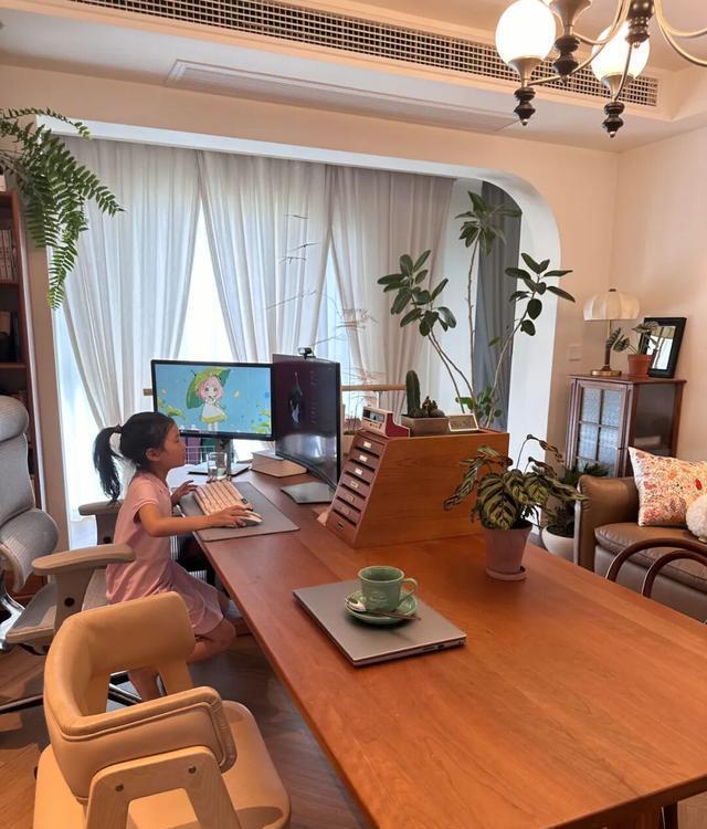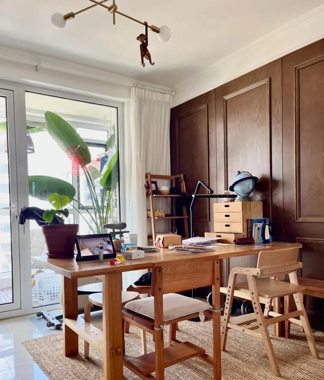 我家小户型,客厅直接摆了一张2米长的大木桌,吃饭、工作、孩子写作业、老婆做手工,全在这儿解决。