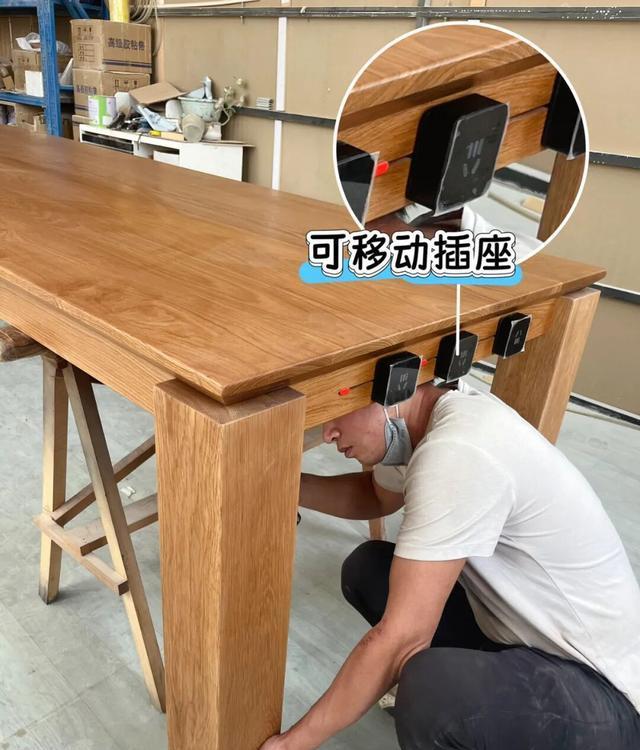 买桌子的时候还可以和卖家沟通好,给桌腿开孔,或者请木工帮忙给桌腿开槽,把电线从桌腿穿到桌面下,接通桌面插座。