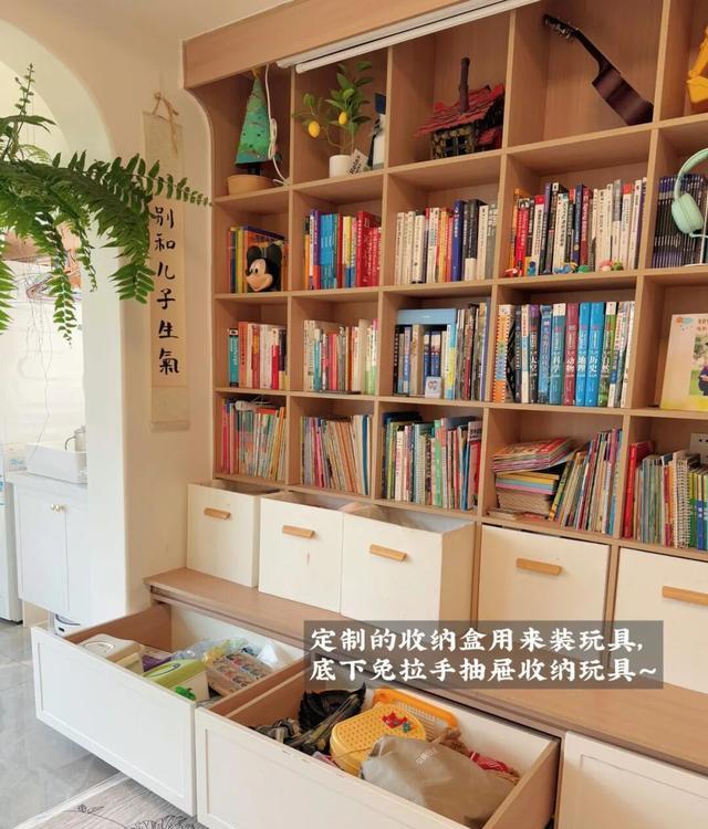 客厅书柜下方还做了一整排卡座,既能当座位坐,取高处书籍时可以踩上去很稳当,而且卡座还可以将日常杂七杂八的东西塞进去收纳。