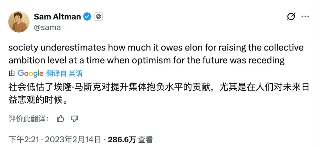 不到一周后,奥特曼似乎付诸行动,他在X上发帖称:“当人们对未来的乐观情绪日渐消退时,埃隆提升了社会的集体雄心水准。社会低估了埃隆所做的贡献。”