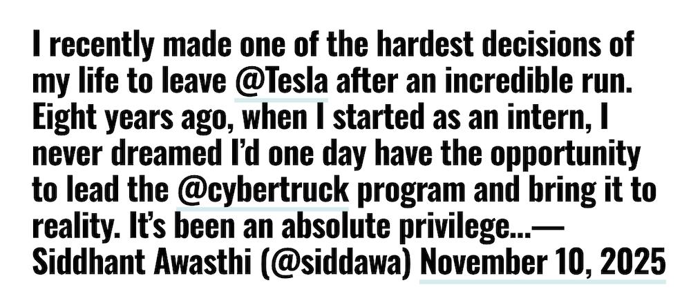 Siddhant Awasthi 是特斯拉原 Cybertruck 和 Model 3 项目负责人,为公司效力八年后宣布离职。