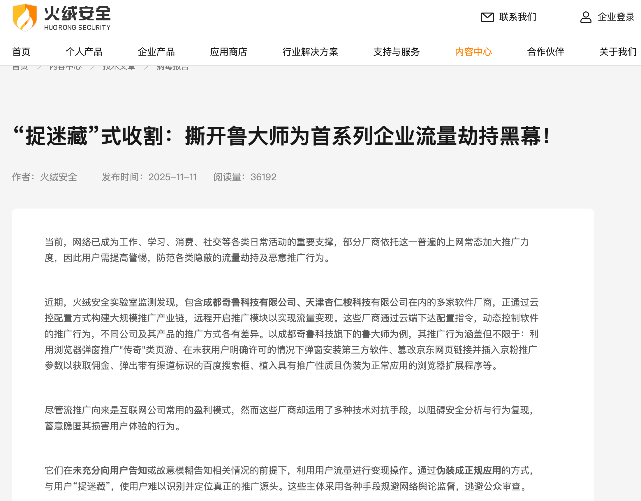 2025年11月11日,火绒安全实验室发布专项报告,揭露了以鲁大师母公司成都奇鲁科技为首的系列企业构建的大规模流量劫持产业链。这些企业通过云控配置远程操控软件推广行为,在未充分告知用户的情况下,以“捉迷藏