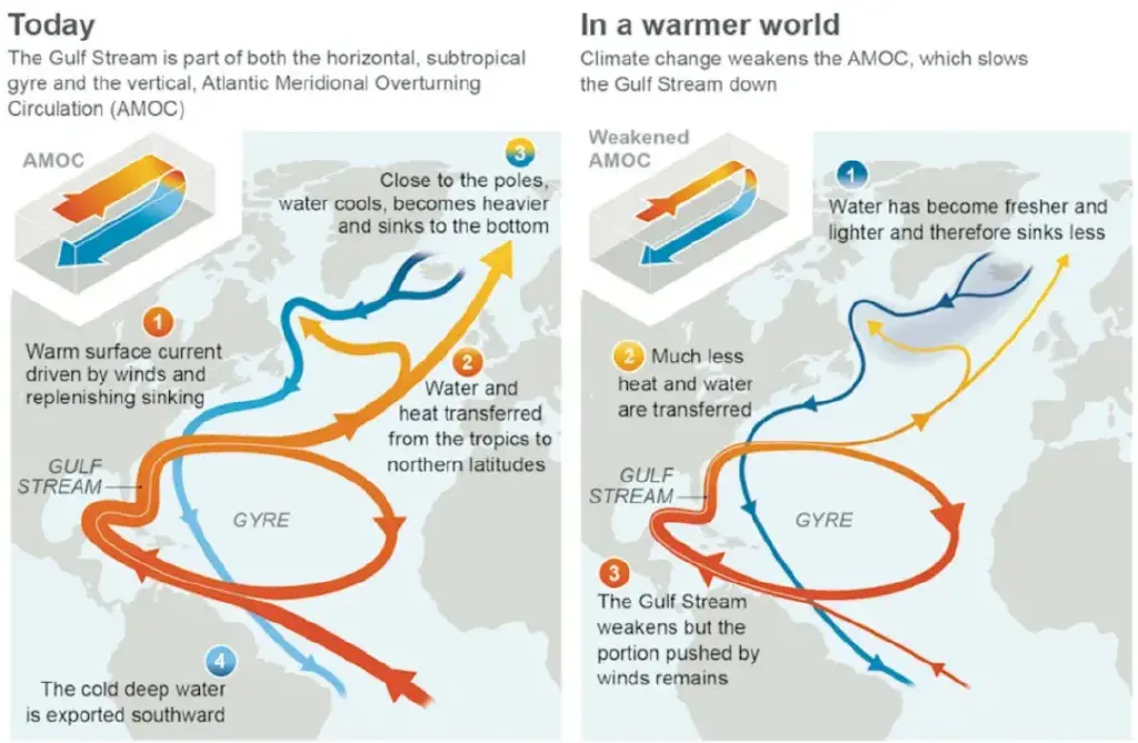 对于AMOC的发展,其实最终趋势、走向崩塌的话,就进入到我们地球极寒,小冰河时期的发展,这个研究已经很多在说明了,也常常被不少人说,这就是“后天”的模式。