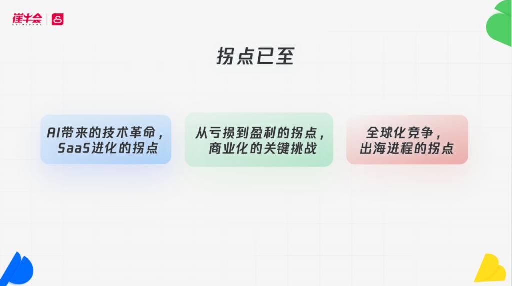 崔强认为,这场“成人礼”由三大结构性拐点驱动:AI 带来的技术革命、从亏损到盈利的商业拐点,以及全球化竞争的格局拐点。其中,“出海”已成为中国企业软件走向成熟的必修课——但它并非普惠机会,而是一场“尖子生”的资格赛。