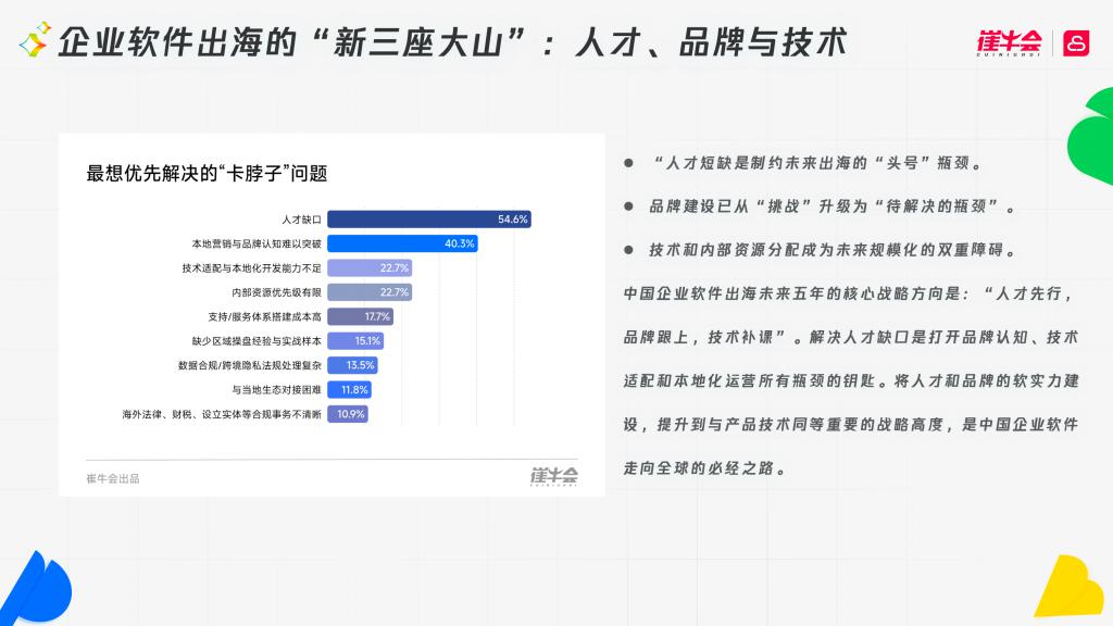 毋庸置疑,最重的三大障碍依次是人才瓶颈(54.6%),国际化人才的招聘与管理成为最关键障碍;其次是品牌信任度(40.3%),品牌认知度不足和信任赤字,成为最重要的瓶颈;相比之下,对技术瓶颈的担忧度最低,侧面印证了中国软件在技术能力上的突出优势。