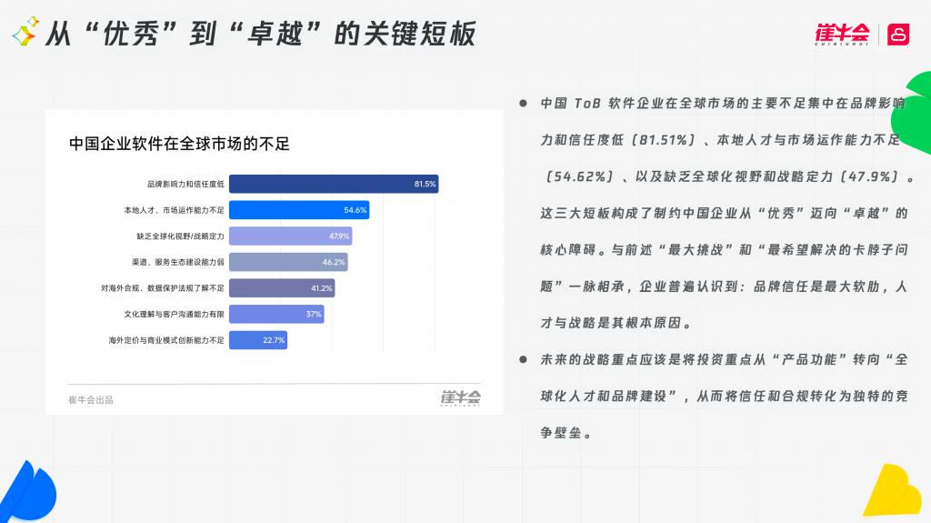 结构化的挑战意味着,从“优秀”到“卓越”,中国企业软件必须解决战略极度短板的问题。未来的战略重点,应是将投资从产品功能转向全球化人才和品牌的建设。