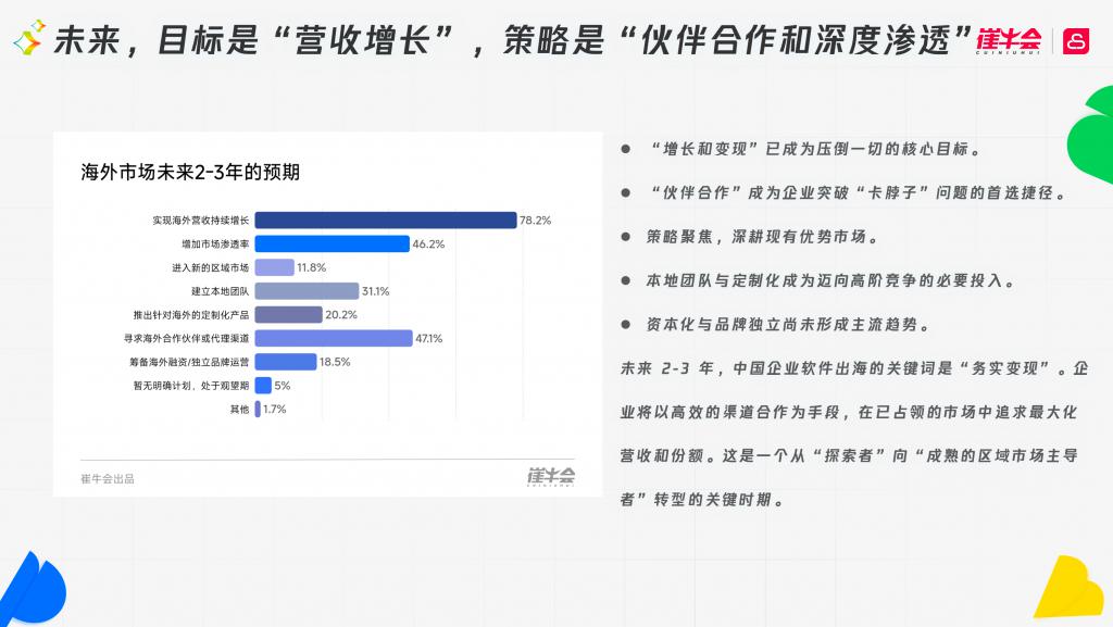 在未来两到三年,首要目标依然是增长变现(78.2%)。为达成这一目标,企业采取了务实的“聚焦突破”策略:积极寻找并确认本地合作伙伴,并通过深度挖掘现有客户和市场的潜力来挖潜内部渗透。