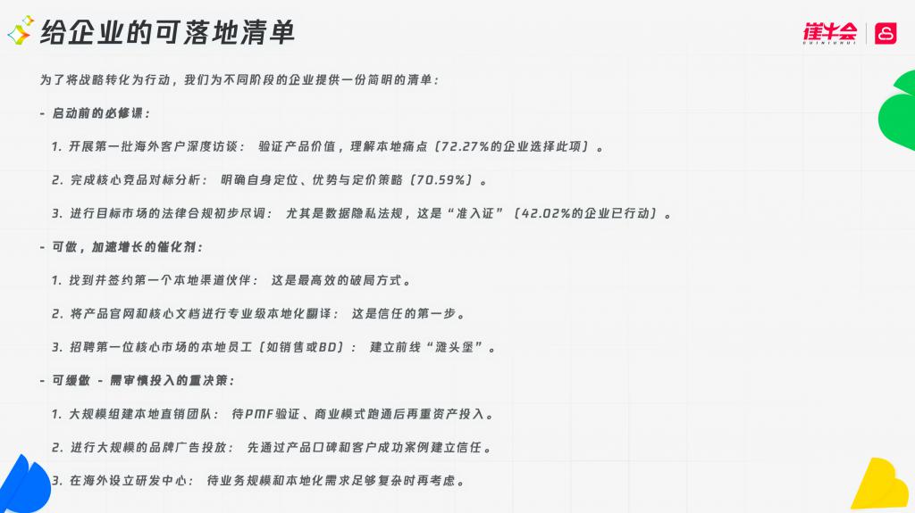 对于正在备战出海的企业,有三个必须在启动前完成的硬性动作:启动前,必须完成第一批客户的深度访谈,确保市场和产品的匹配度;完成核心竞品的分析,解决“未来怎么赢”的问题;并完成数据合规的准入账,将合规工作前置。