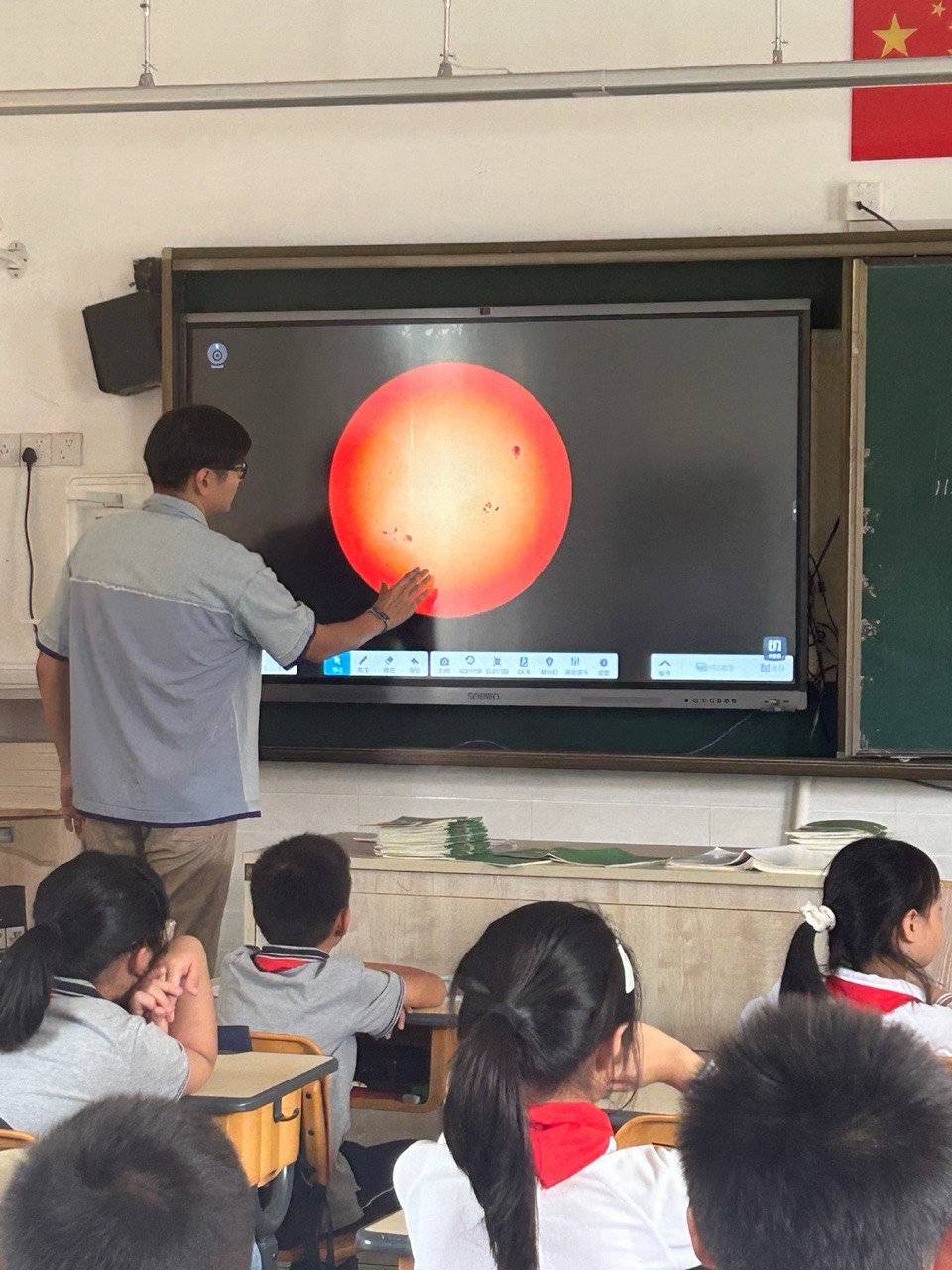 他有时会把自己的摄影作品带到学校,让学生们欣赏,或者让这些真实而难得的画面成为孩子们画画的素材。他还曾把观测设备带到了校园,让学生们在教室外亲自观察太阳黑子之类的天文现象。