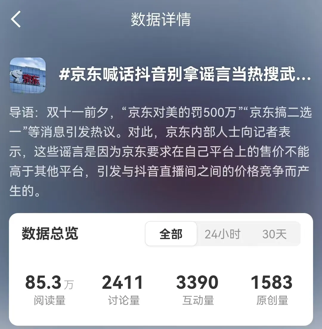 前段时间,京东和抖音打起来了。“京东对美的罚500万”“京东搞二选一”等谣言引起热议,是因为京东要求在自己平台上的售价不能高于其他平台,引发与抖音直播间之间的价格竞争而产生的。为此,双方互相开炮,相关话题频频冲上热搜。