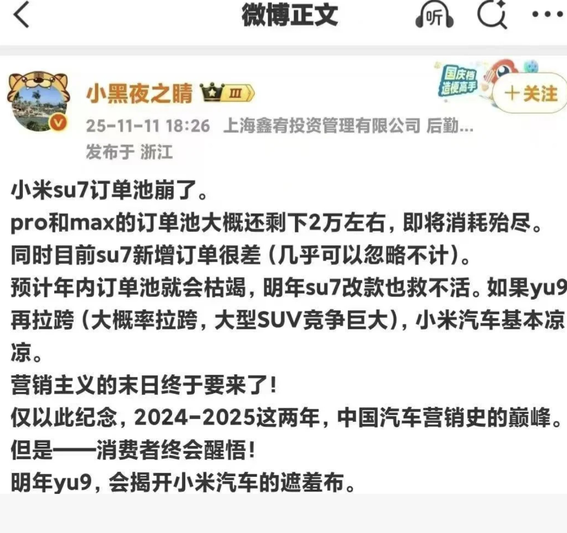 但营销带来的热度终究难以持久。随着消费者新鲜感褪去,市场回归理性,小米 SU7 的订单增长开始断崖式下滑。有业内人士分析,小米汽车过度依赖营销造势,却在产品核心竞争力的打磨上有所欠缺,当营销光环褪去,产品本身的短板逐渐暴露,消费者自然不再买单。“营销主义的末日终于要来了” 的声音,正是市场对这种 “重营销、轻产品” 模式的直接反噬。