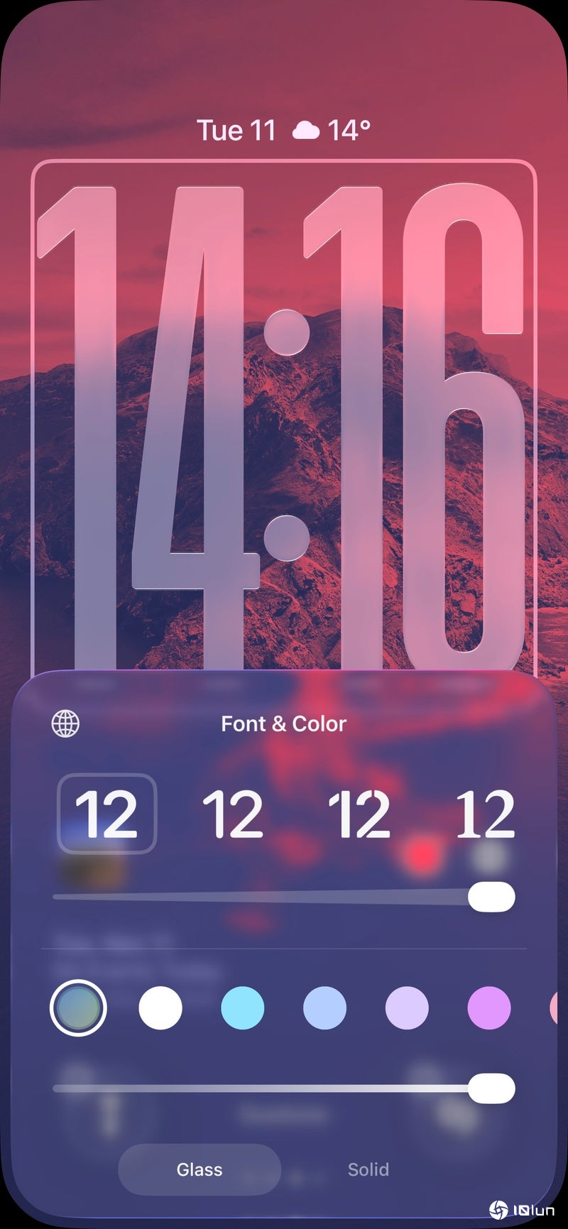 锁屏上的液态玻璃更具个人化首先,我们获得了一个巧妙的新滑块,可让您调节锁屏时钟的液态玻璃强度。该滑块提供了相当广泛的调节范围,您可以将液态玻璃时钟面设为完全不透明、完全透明,或介于两者之间的任