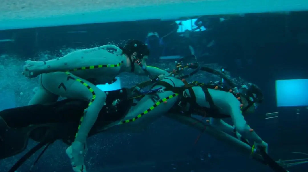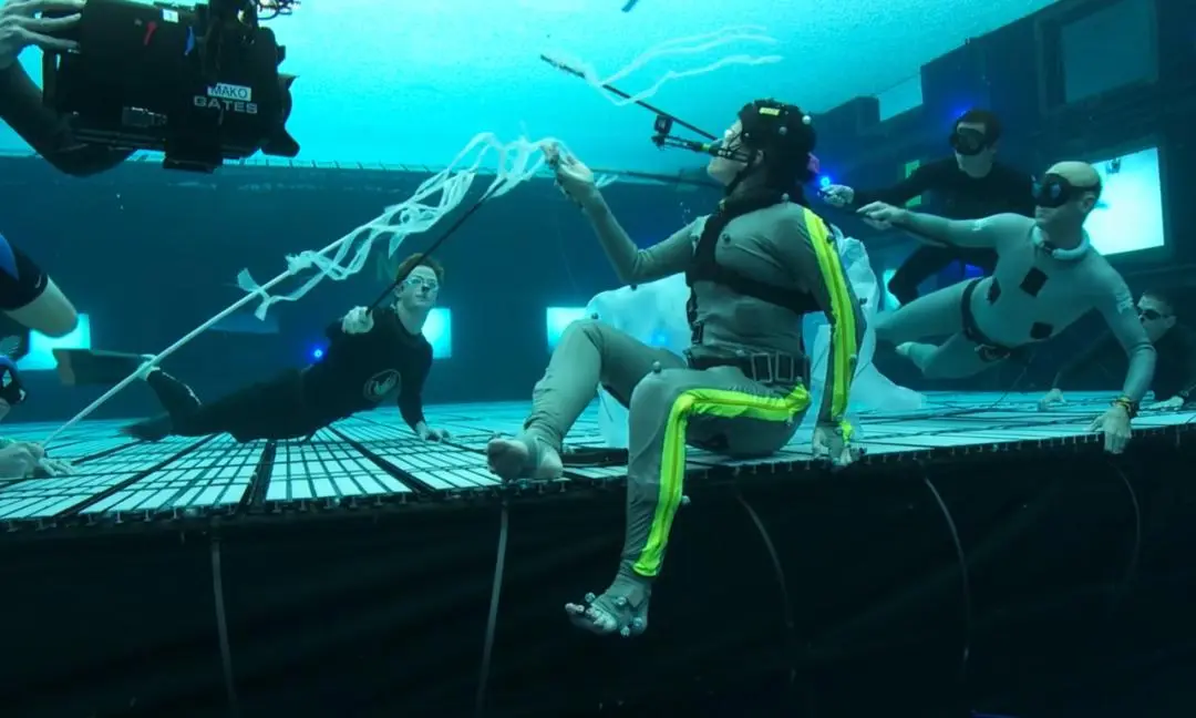 最初,团队尝试了行业内常见的“以干拍湿”方案,即用钢丝和吊臂将演员吊在空中,模拟游泳的动作。然而,这个方案很快被卡梅隆否决。