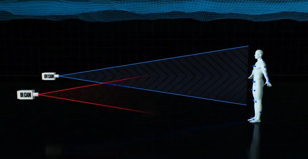 为此,团队创造了一个匪夷所思的“双层虚拟摄影棚”:上层空间(空气中)使用传统的红外摄影机系统;下层空间(水中)使用新开发的紫外线摄影机系统。
