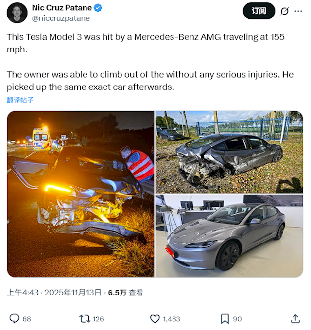特斯拉Model 3被时速250公里奔驰AMG撞毁:车主无碍 又提了一台