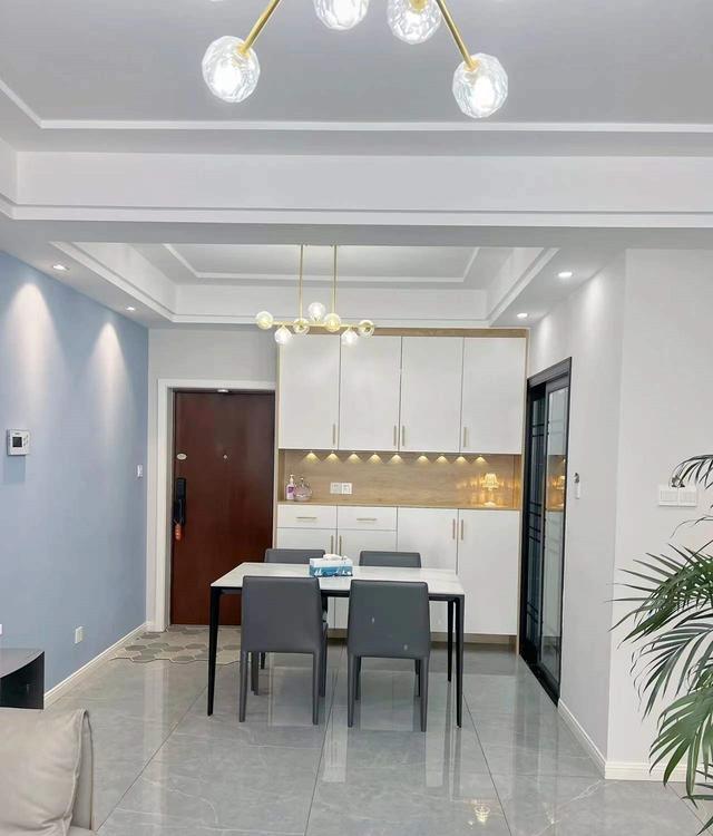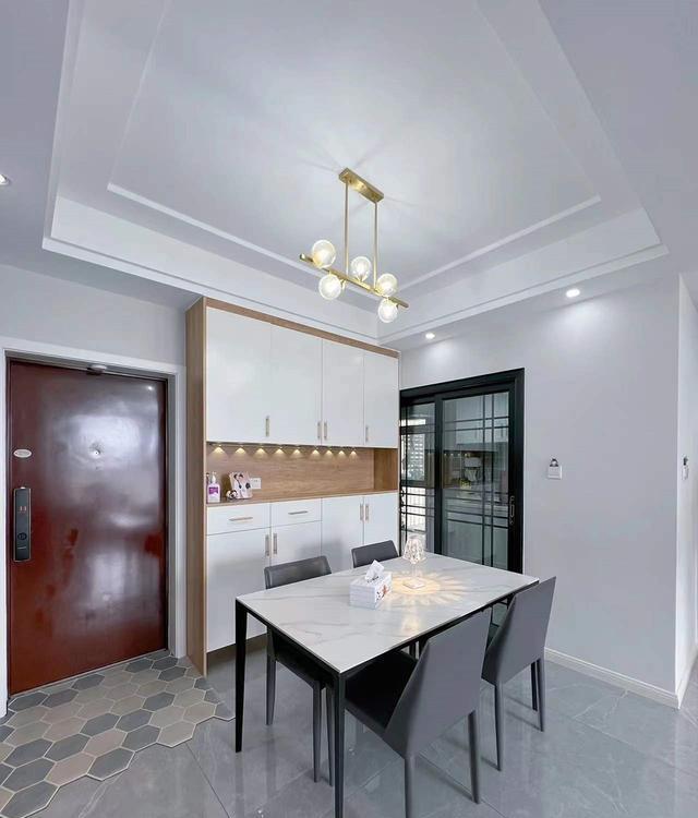 沿着墙边精心打造的餐边柜,如一幅雕刻细腻的画卷,上下封闭的门板和中间巧妙镂空的设计,将实用性和艺术性相得益彰。它不仅为餐具提供了安静的栖息之地,更为整个空间注入了一份贵族般的优雅气质。