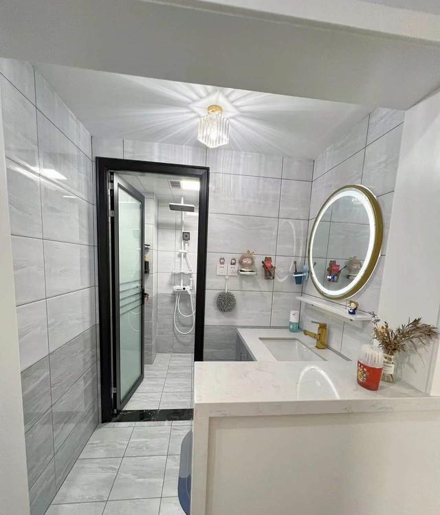 卫生间的整体色调以灰色为主,既大气又耐脏。这种灰色调的选择使得整个空间呈现出一种现代而低调的感觉;