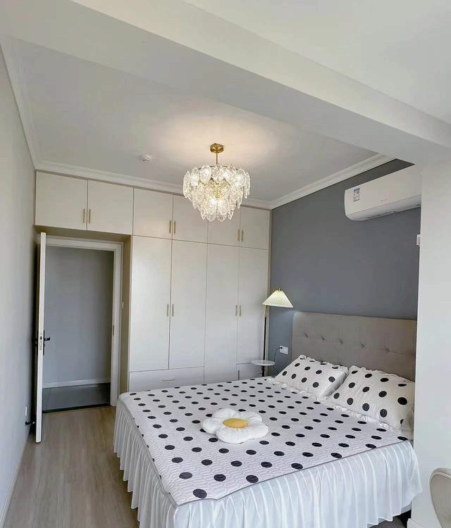 在床的上方,水晶花朵灯如同夜空中闪烁的星星,点缀在空间中,为主卧增添了一份浪漫的氛围。