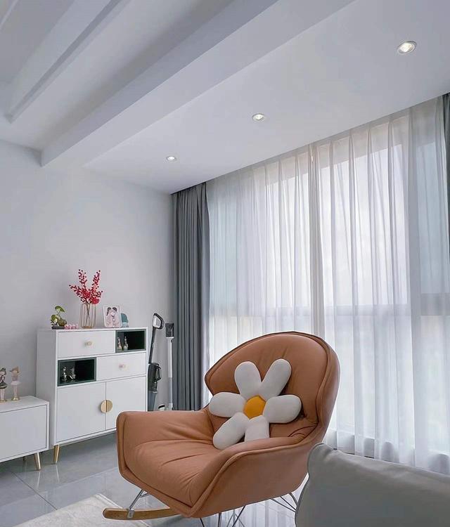 阳台与客厅自然地融为一体,仿佛是将室内与室外的界限消弭,打造出一个宁静而通透的空间,在这个令人心驰神往的角落,一张摇椅如同一个轻盈的音符,悠扬地放置其中。