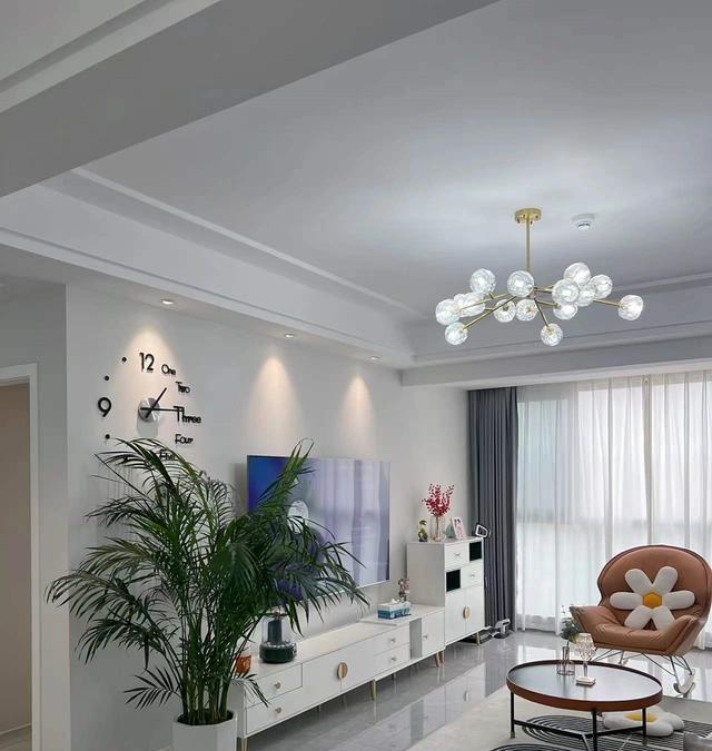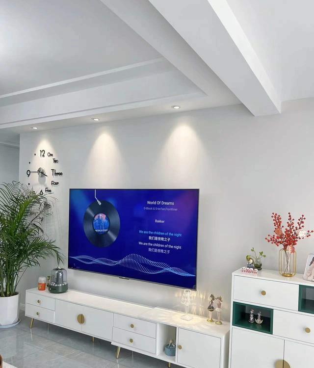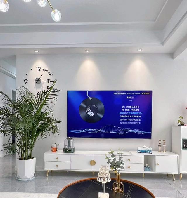 电视柜旁边放置一盆散尾葵,犹如一位优雅的舞者,轻盈地点缀在空间的一角,散尾葵的翠绿叶片在灰色背景的映衬下更显清新动人,为电视区域注入了一份自然与生机。