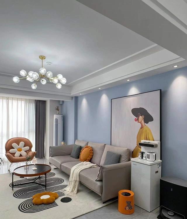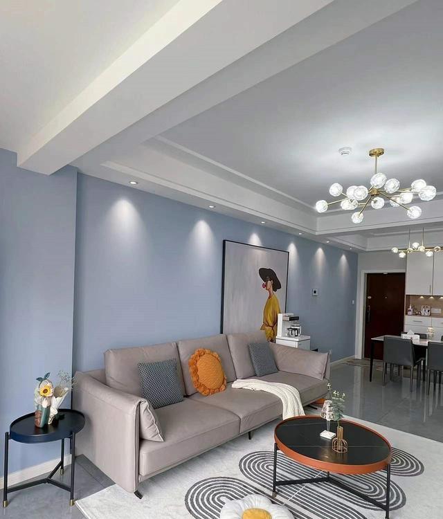 客厅成为了一处艺术的沉浸之地,沙发背景经过涂刷灰蓝色的乳胶漆,犹如一片宁静的湖泊,给整个客厅带来了一份柔和而深邃的氛围,当射灯的光线洒在墙上时,仿佛是小山丘的光影在跳动,为空间增添了一份温暖而梦幻的气息。