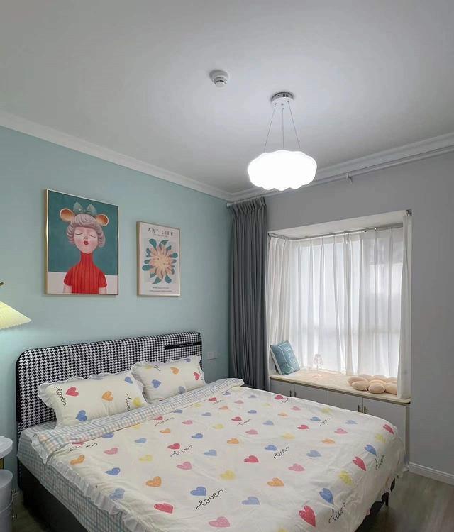 大床选用了千鸟格的设计,搭配彩色爱心床品,呈现出一种青春活力的感觉,这种色彩的搭配使得床成为次卧的亮点,同时也为整个房间增添了一份轻松而愉悦的氛围。