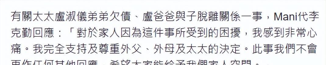 李克勤的妻子卢淑仪发声回应,称因为弟弟的债务问题,目睹年迈父亲晚年饱受煎熬,十分痛心,多年以来,全家已竭尽所能,多次为其处理债务,几乎倾尽所有但情况未见改善,与家人商议后才做出艰难决定。