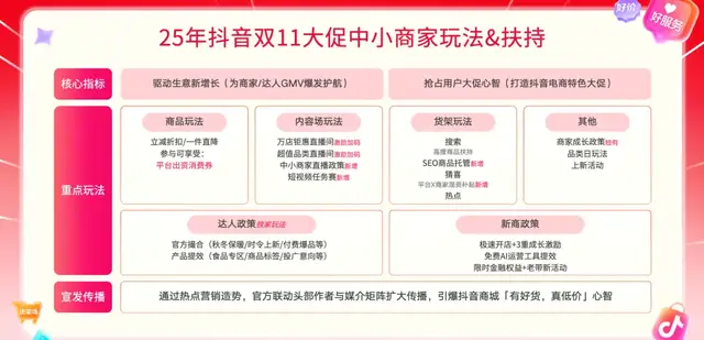 一方面是降低门槛和经营成本,免佣、降费、现金补贴、物流保障等政策投入,持续优化商家交易流程,同时针对新商家推出了“极速开店成长激励、免费AI运营工具提效、限时金融权益、老带新活动”等举措,鼓励更多中小商家在抖音起步。另一方面,此次双11抖音电商为中小商家提供了更丰富的营销玩法、全方位的资源扶持以及海量的经营攻略指导,中小商家无需担心不会玩,只要跟上平台节奏、积极参与就有机会获得各类流量和资源扶持。