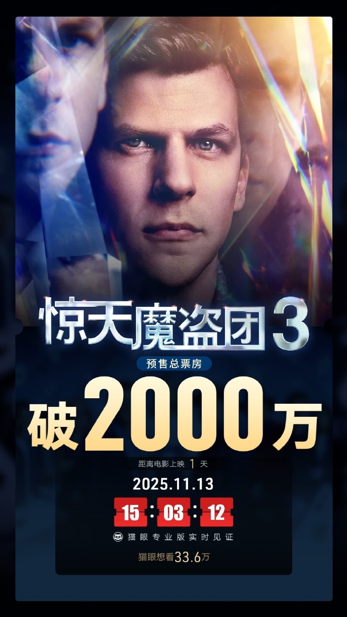 11月13日,据猫眼专业版数据,电影《惊天魔盗团3》映前1天,点映及预售总票房破2000万元。
