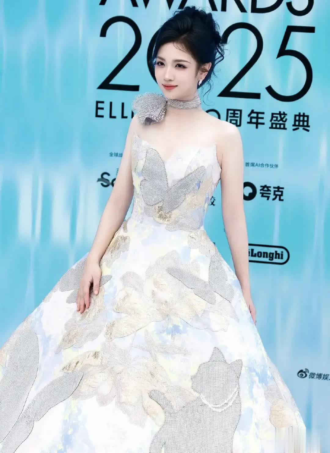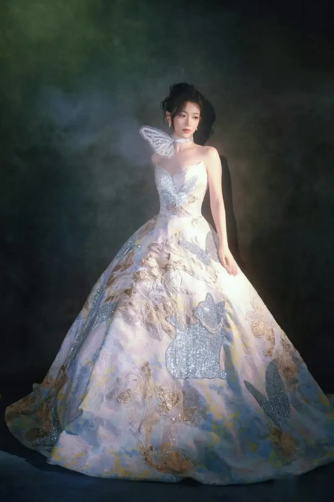 礼服的设计充满艺术巧思,通体采用精细手工刺绣,贝壳纹理与蝴蝶图案交错分布,层次丰富且极具视觉张力。背部巨大的立体蝴蝶结与垂坠的薄纱幔形成独特的“贝壳开合”动态结构,行走间裙摆如浪花翻涌,纱幔轻扬似海风拂面。代露娃身高165cm,体重45kg,纤细身形却完美驾驭了这套重达15斤的庞大规模礼服,不仅未显单薄,反而以轻盈体态赋予其生命力,展现出极强的时尚表现力与镜头掌控力。