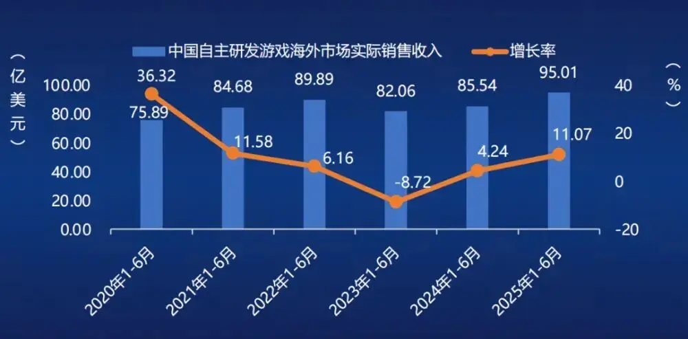 《2025年1-6月中国游戏产业报告》显示,上半年自研游戏海外市场实际销售收入达到了95.01亿美元,同比增长11.07%。这个数字背后,说明出海已经成为一条越来越主流、重要的赛道。