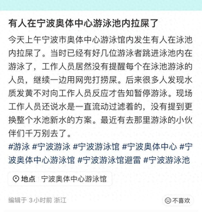 11月14日,多位网友在社交媒体平台发文表示,在浙江宁波奥体中心游泳馆游泳时,发现泳池内疑似出现粪便污物。