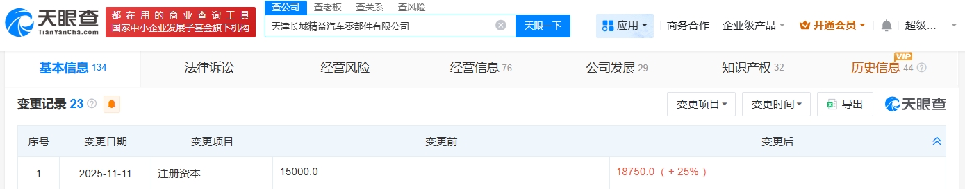 天眼查App显示,近日,天津长城精益汽车零部件有限公司发生工商变更,注册资本由1.5亿人民币增至约1.88亿人民币,增幅25%。